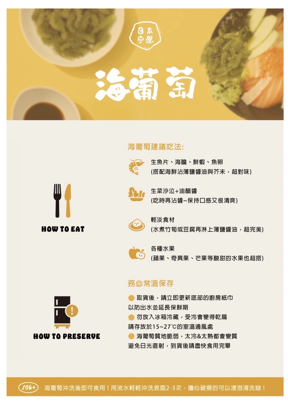 但有一點要注意,一旦淋上醬汁並放置一段時間,海葡萄就會枯萎小,失去原創獨特的美味因此想要品嚐海葡萄清爽的口感的話,不要淋上醬汁,而是沾醬建議食用