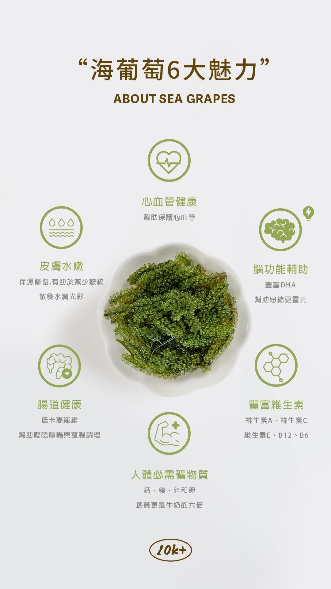 海葡萄的碳水化合物極低,每100克只有約4至6kcal,即使在瘦身節食時也可以放心食用~補充膳食纖維、過量(尤其是鈣和鐵)和B群維生素,注意健康和美容人們的喜愛!鈣、鎂和鋅等膳食纖維有助於補充健康,而鎂和鉀等則有助於人體排出剩餘鹽分,並有益於美容健康。 「木樹萃取」同樣具有美容功效的營養成分,能夠促進新陳代謝。